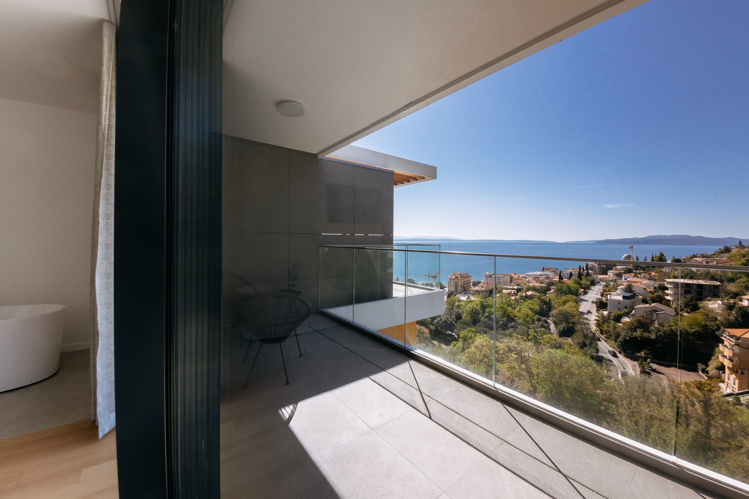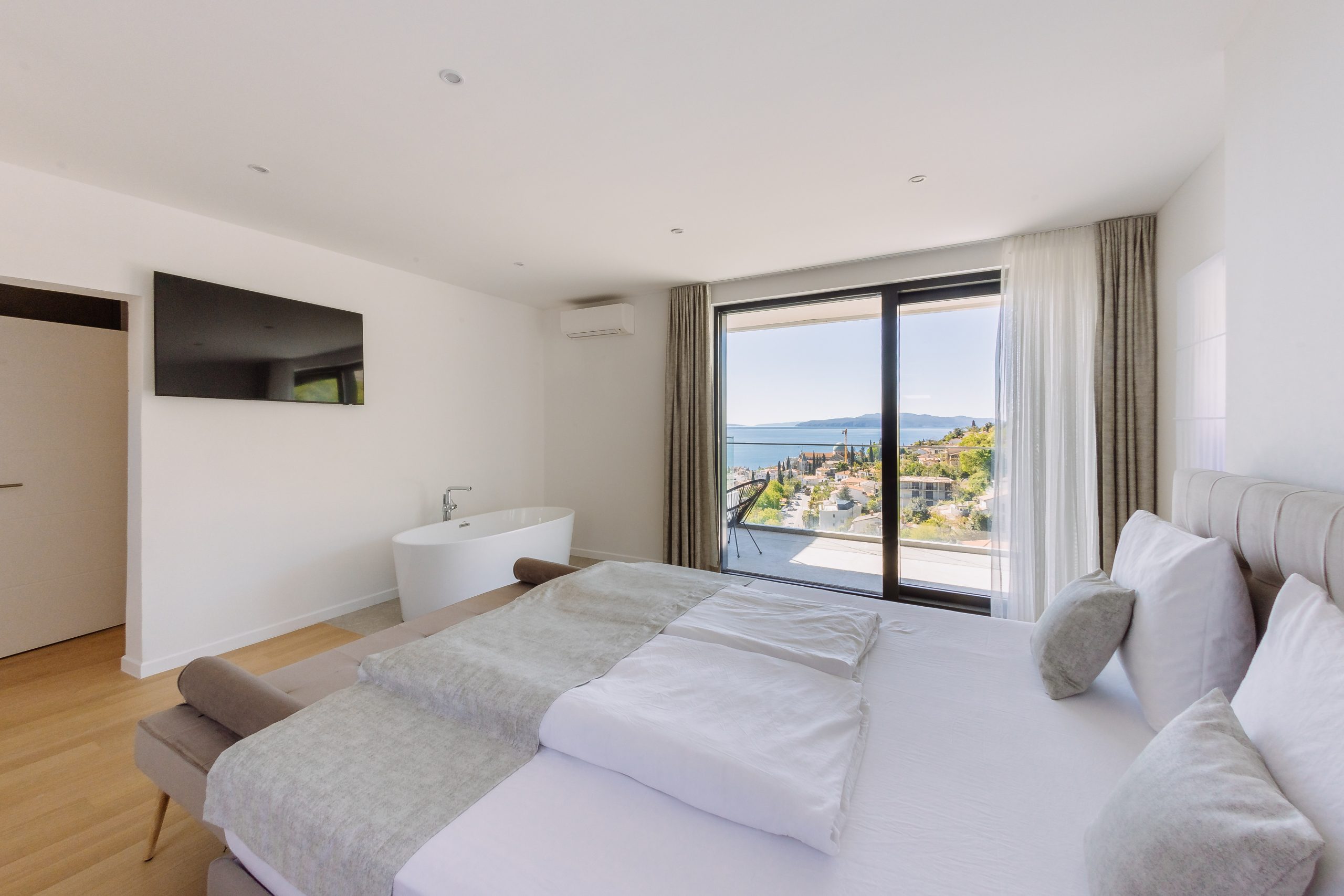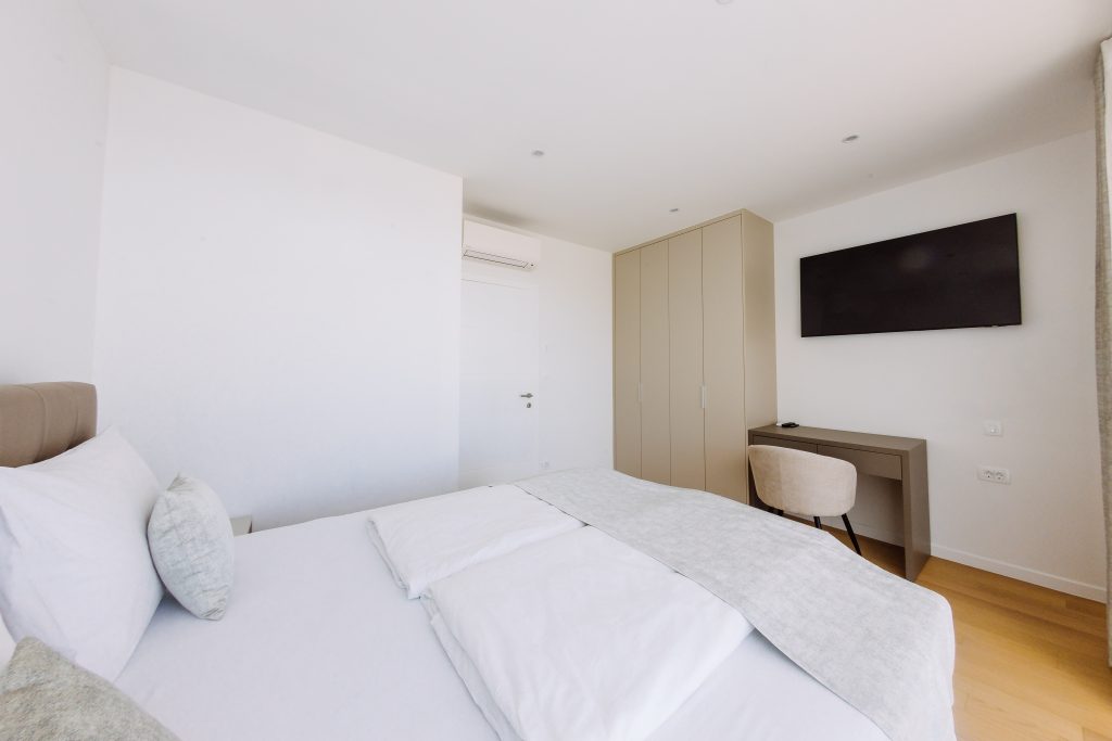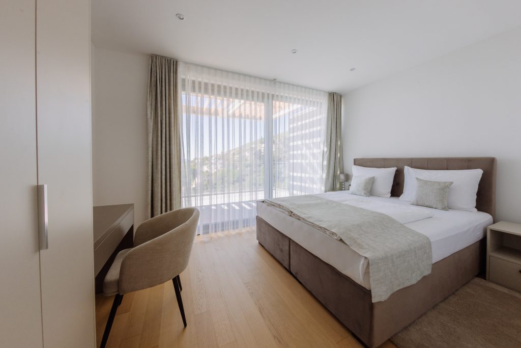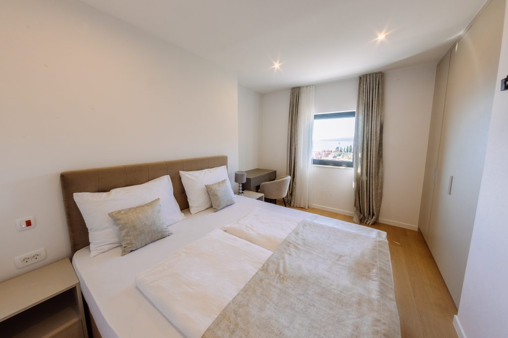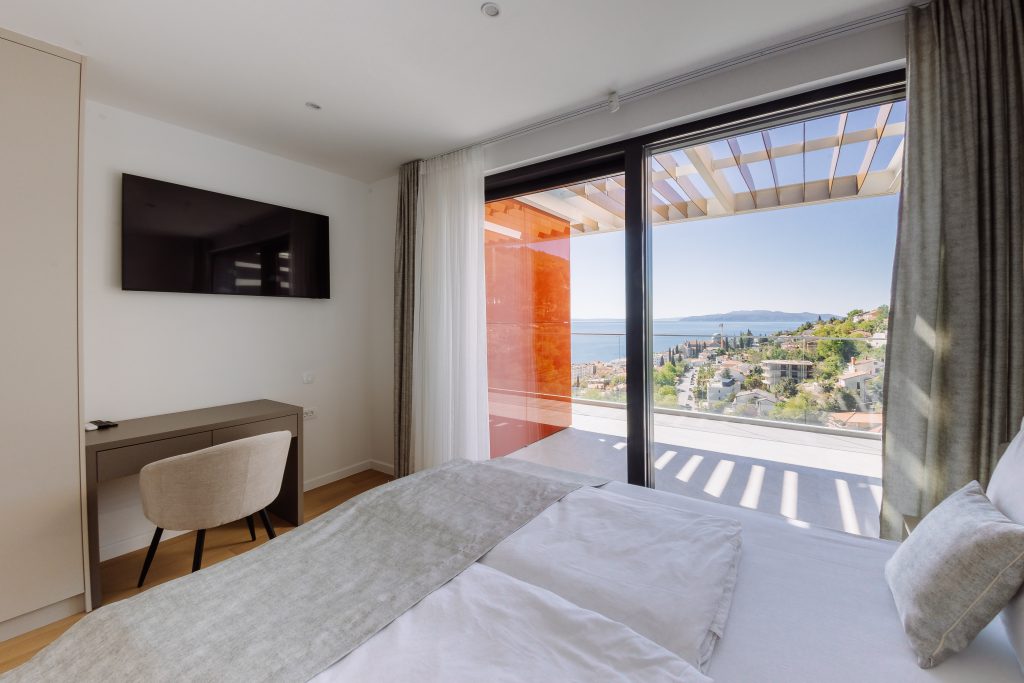 - Pogodnosti / Sadržaji: Klima uređaj, Kompletno opremljena kuhinja sa svim aparatima i posuđem, Kućni ogrtači i papuče, Luksuzan namještaj, Paket proizvoda za kupanje i njegu, Parking, Pogled na more, Posteljina i ručnici, Sat/TV, Sef, Smart Home tehnologija, Spavaća soba odvojena od dnevnog boravka, Sušilo za kosu, Terasa, Wi-Fi