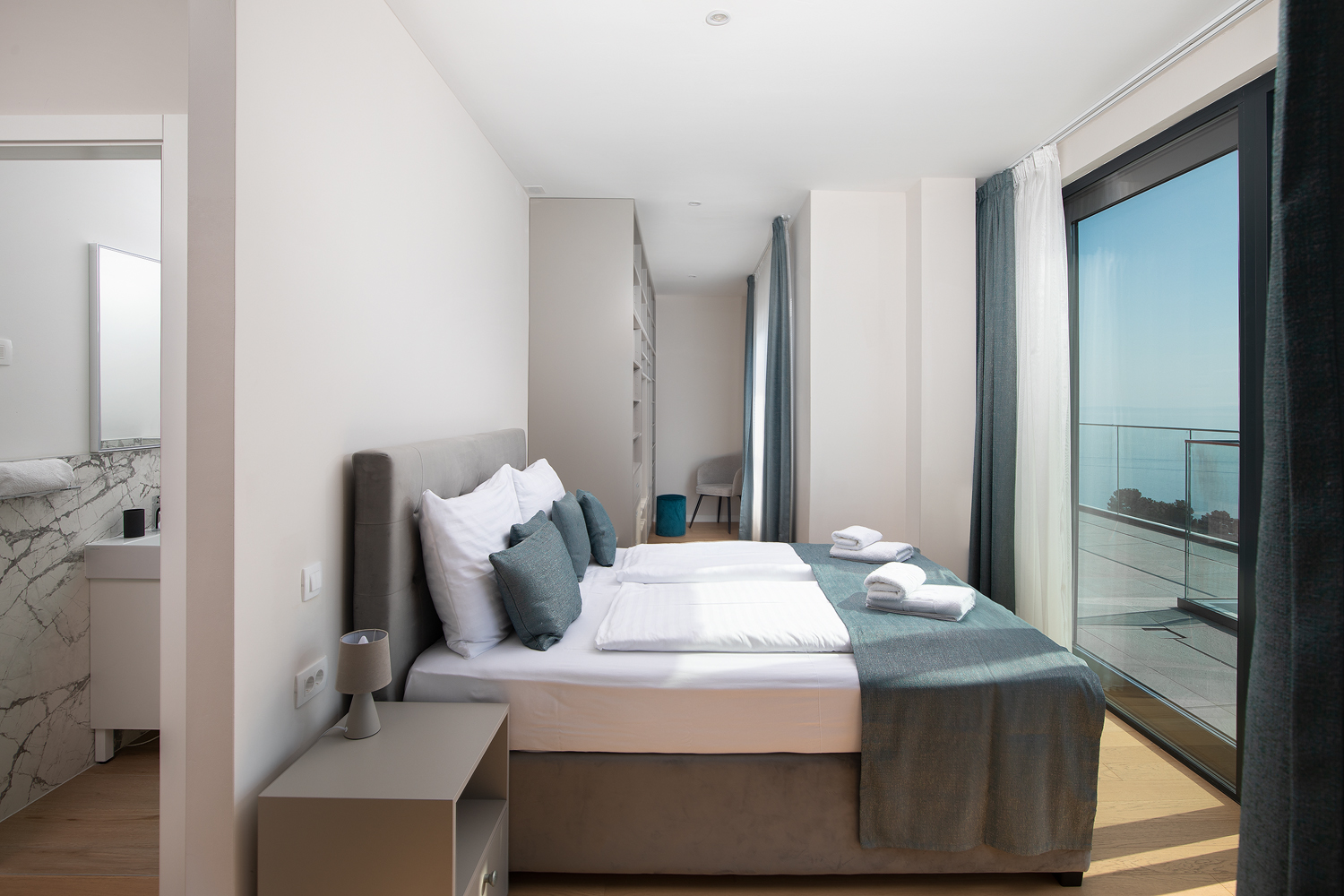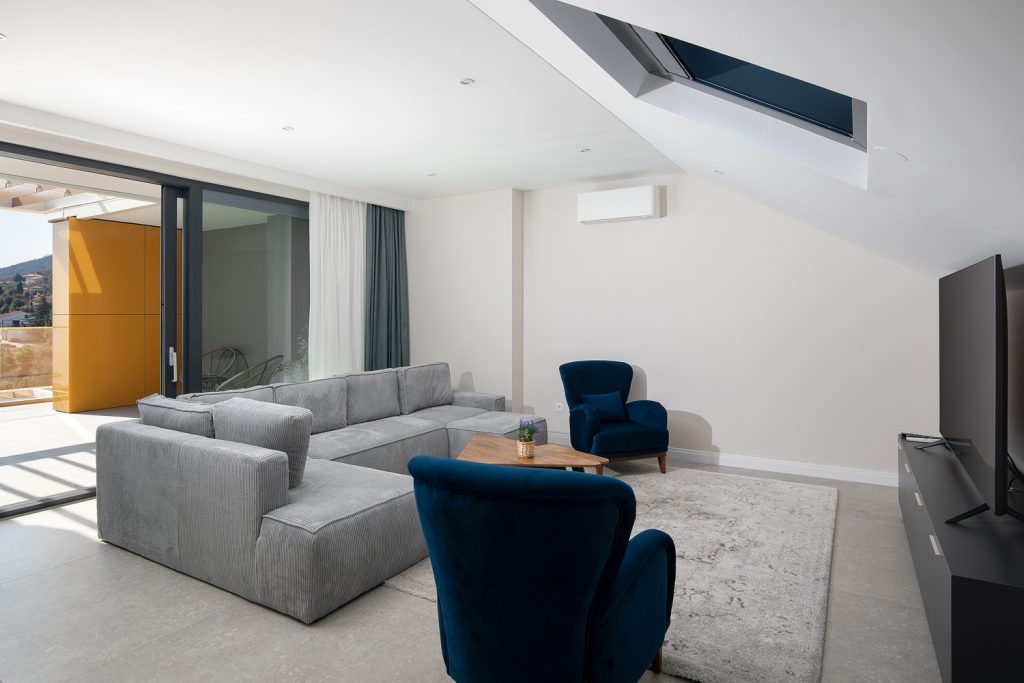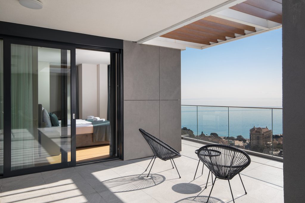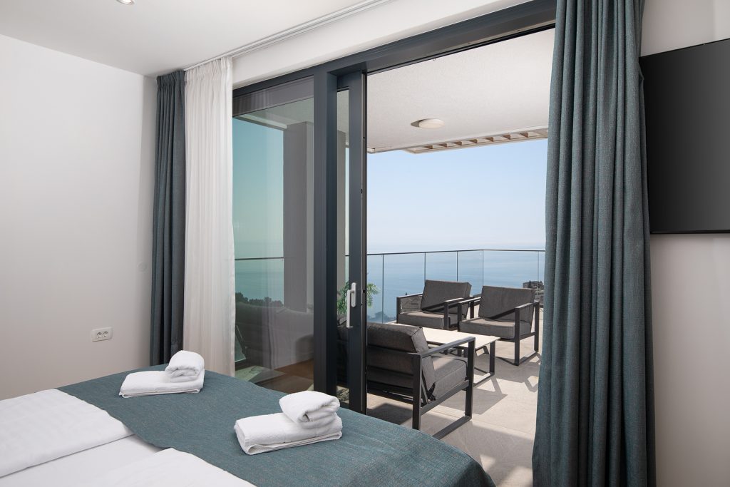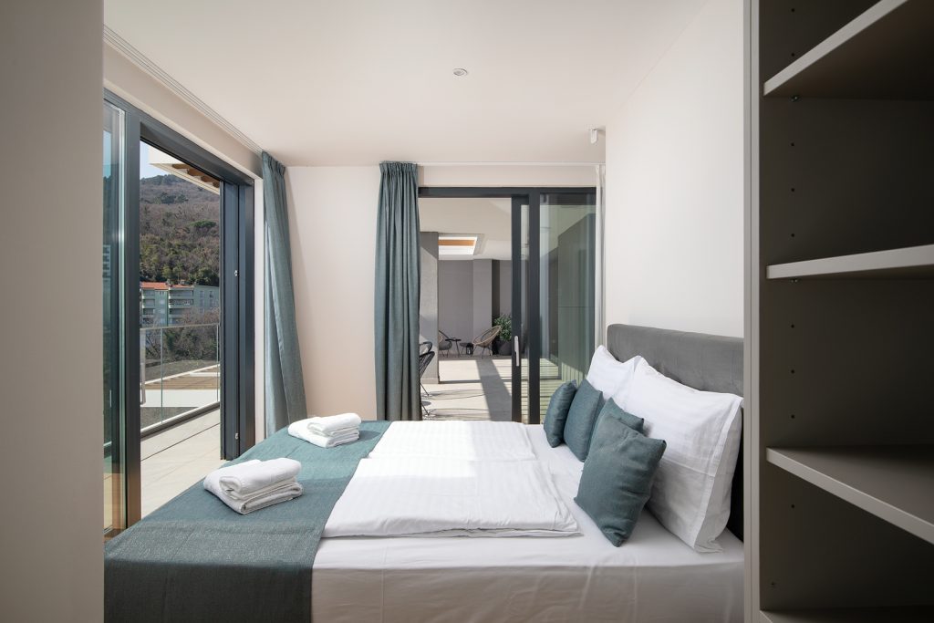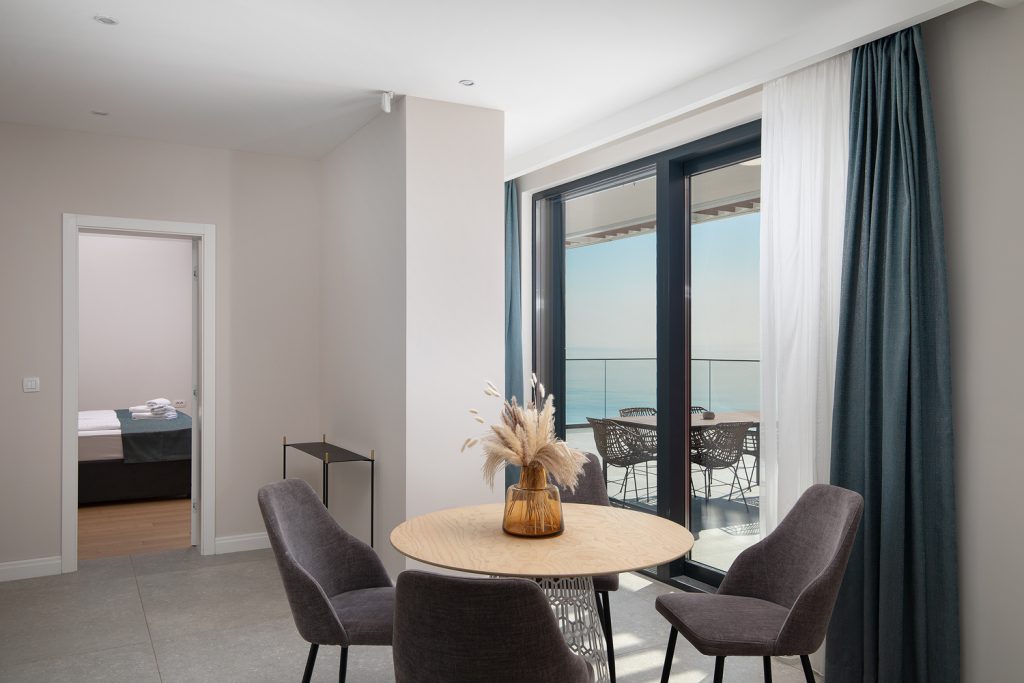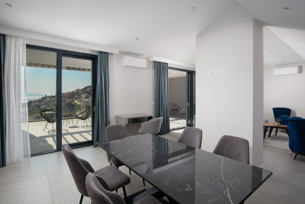 - Pogodnosti / Sadržaji: Klima uređaj, Kompletno opremljena kuhinja sa svim aparatima i posuđem, Kućni ogrtači i papuče, Luksuzan namještaj, Paket proizvoda za kupanje i njegu, Parking, Pogled na more, Posteljina i ručnici, Sat/TV, Sef, Smart Home tehnologija, Spavaća soba odvojena od dnevnog boravka, Sušilo za kosu, Terasa, Wi-Fi
