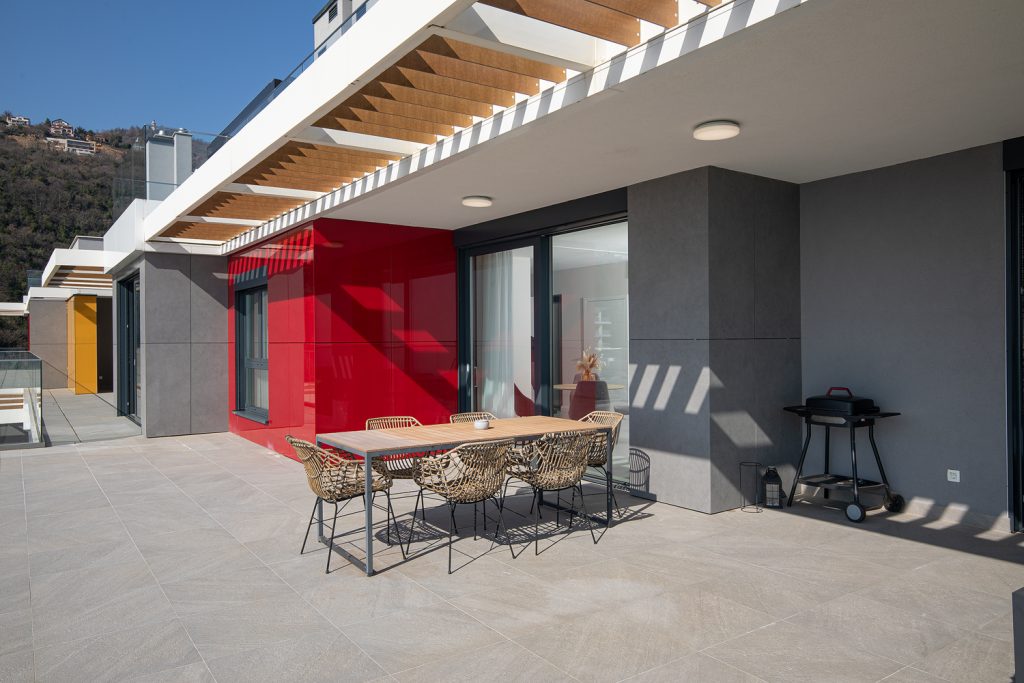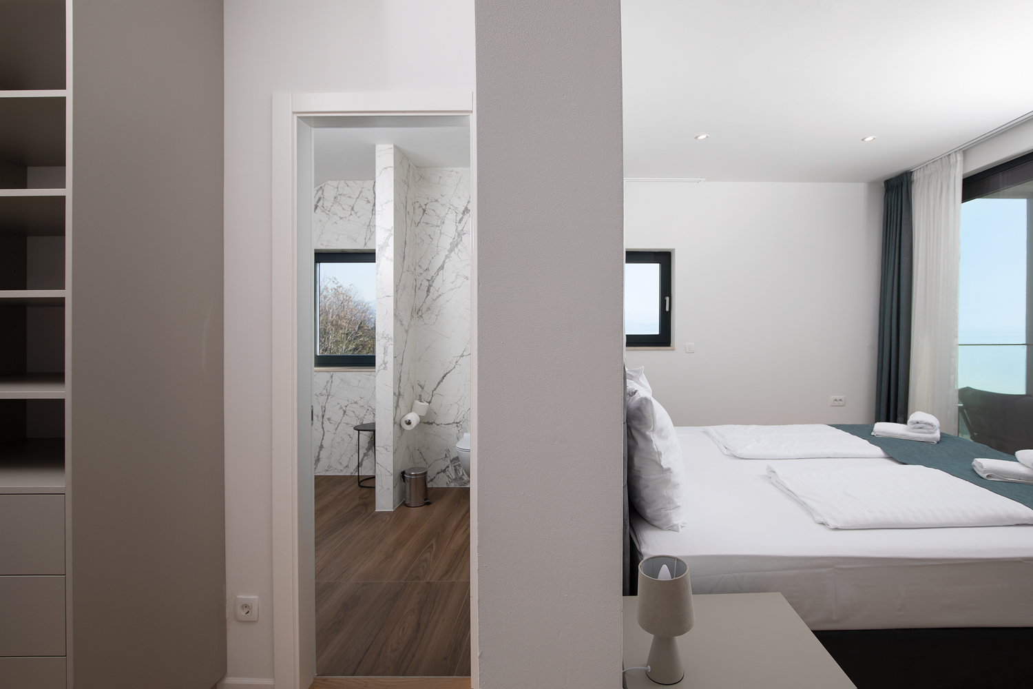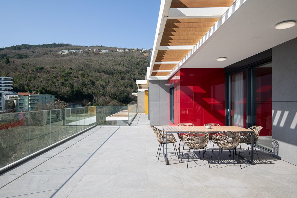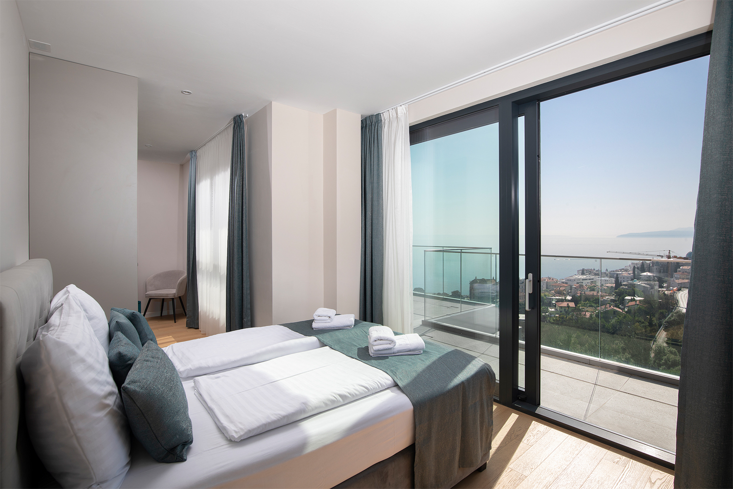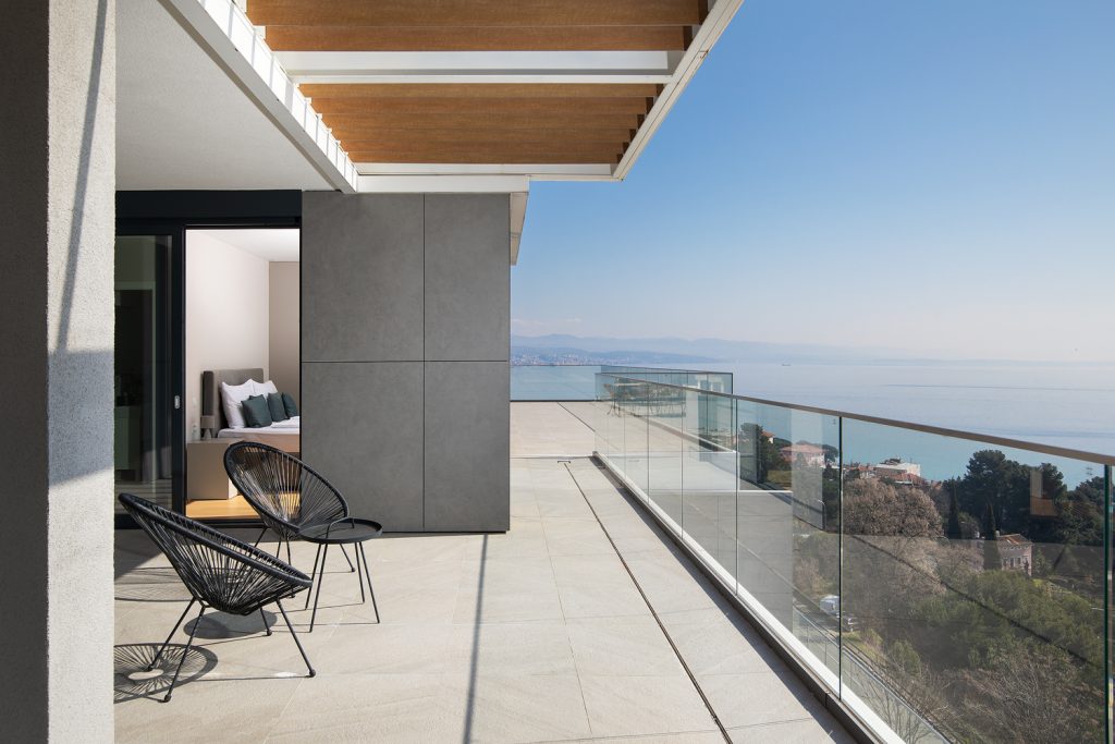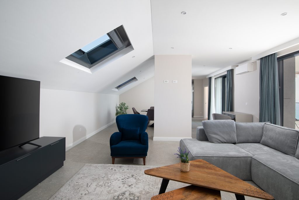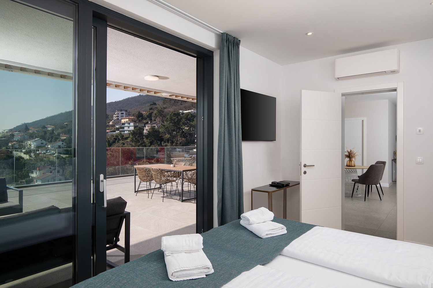 - Pogodnosti / Sadržaji: Klima uređaj, Kompletno opremljena kuhinja sa svim aparatima i posuđem, Kućni ogrtači i papuče, Luksuzan namještaj, Paket proizvoda za kupanje i njegu, Parking, Pogled na more, Posteljina i ručnici, Sat/TV, Sef, Smart Home tehnologija, Spavaća soba odvojena od dnevnog boravka, Sušilo za kosu, Terasa, Wi-Fi