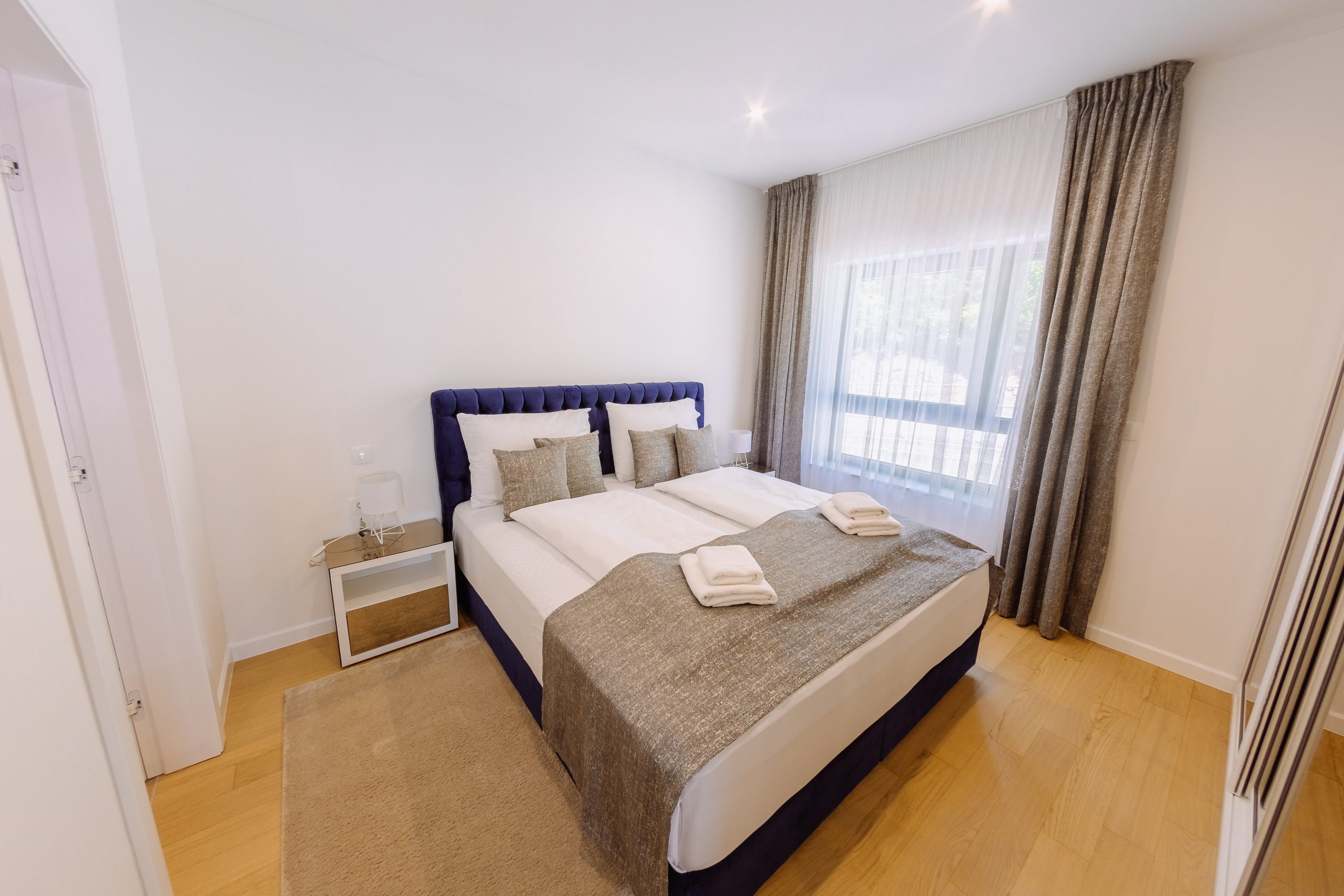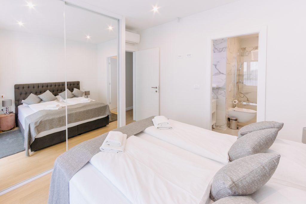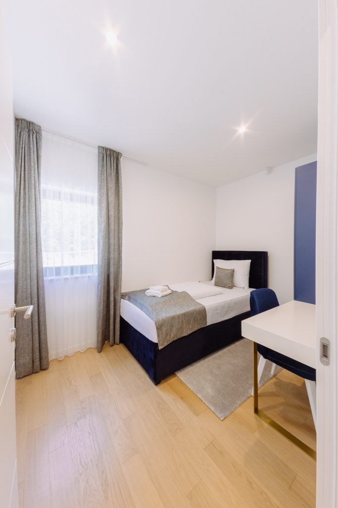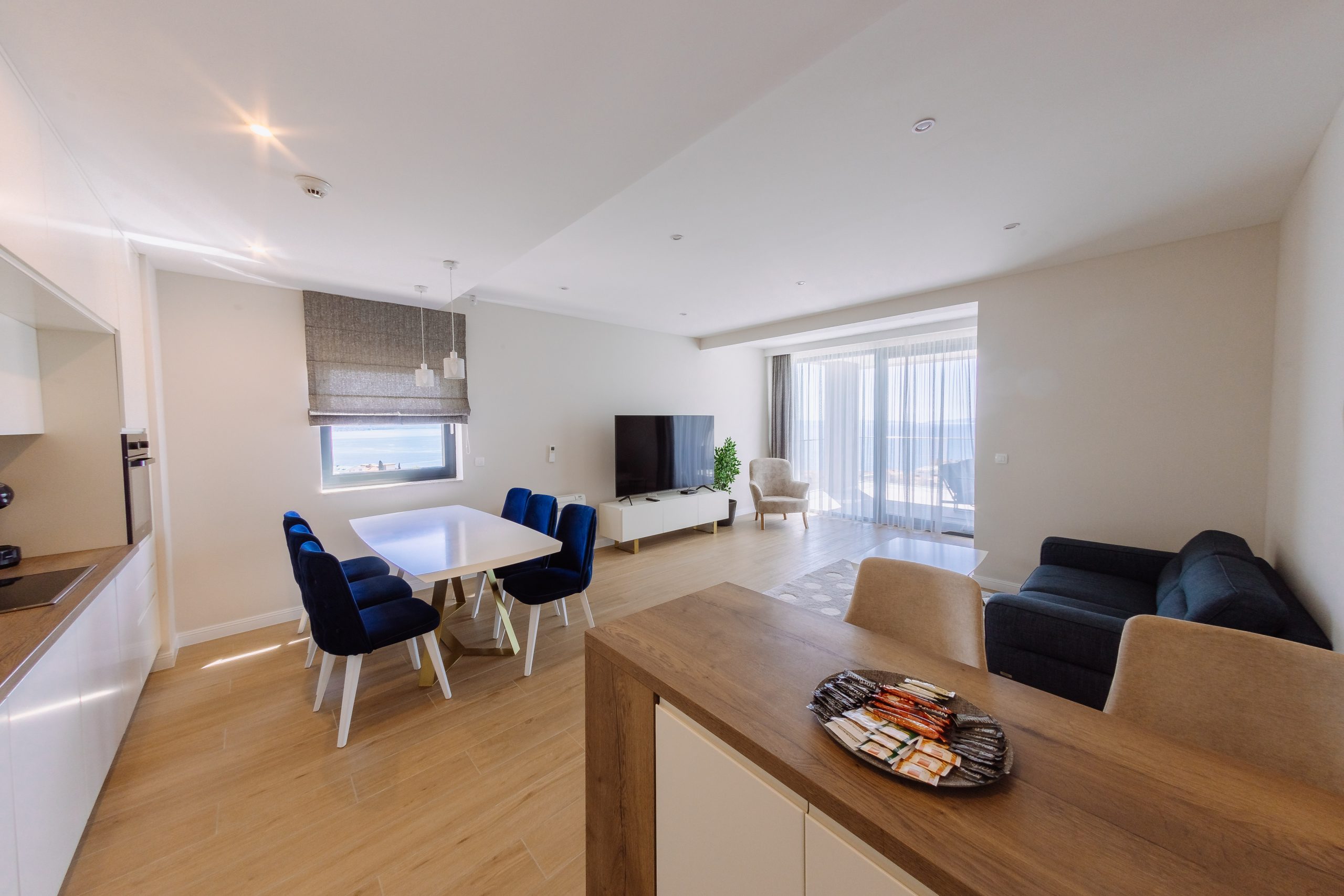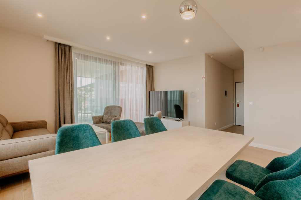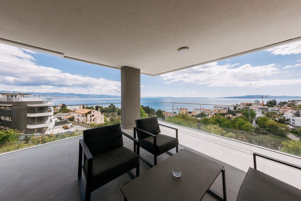 - Pogodnosti / Sadržaji: Klima uređaj, Kompletno opremljena kuhinja sa svim aparatima i posuđem, Kućni ogrtači i papuče, Luksuzan namještaj, Paket proizvoda za kupanje i njegu, Parking, Pogled na more, Posteljina i ručnici, Sat/TV, Sef, Smart Home tehnologija, Spavaća soba odvojena od dnevnog boravka, Sušilo za kosu, Terasa, Wi-Fi
